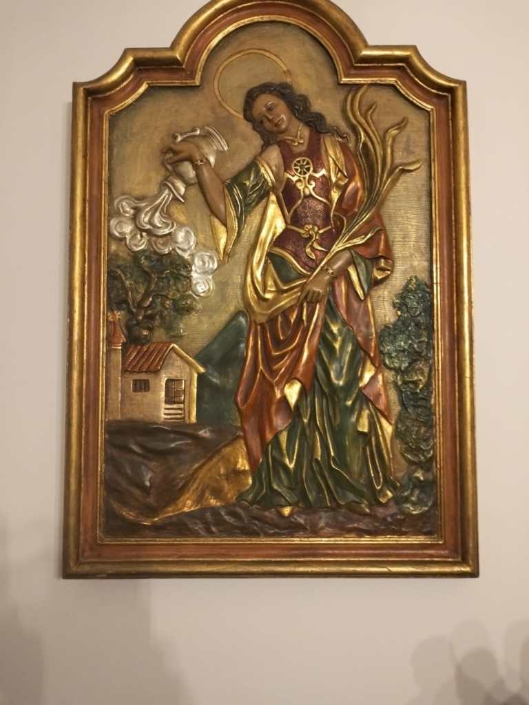Tabla de Santa Eulalia de Mérida, en la que la mártir, celestial patrona de la Diócesis de Oviedo, riega los campos, huertos y jardines de Asturias para que den frutos abundantes. La tabla se encuentra en el Rectorado del Seminario Metropolitano de Oviedo.