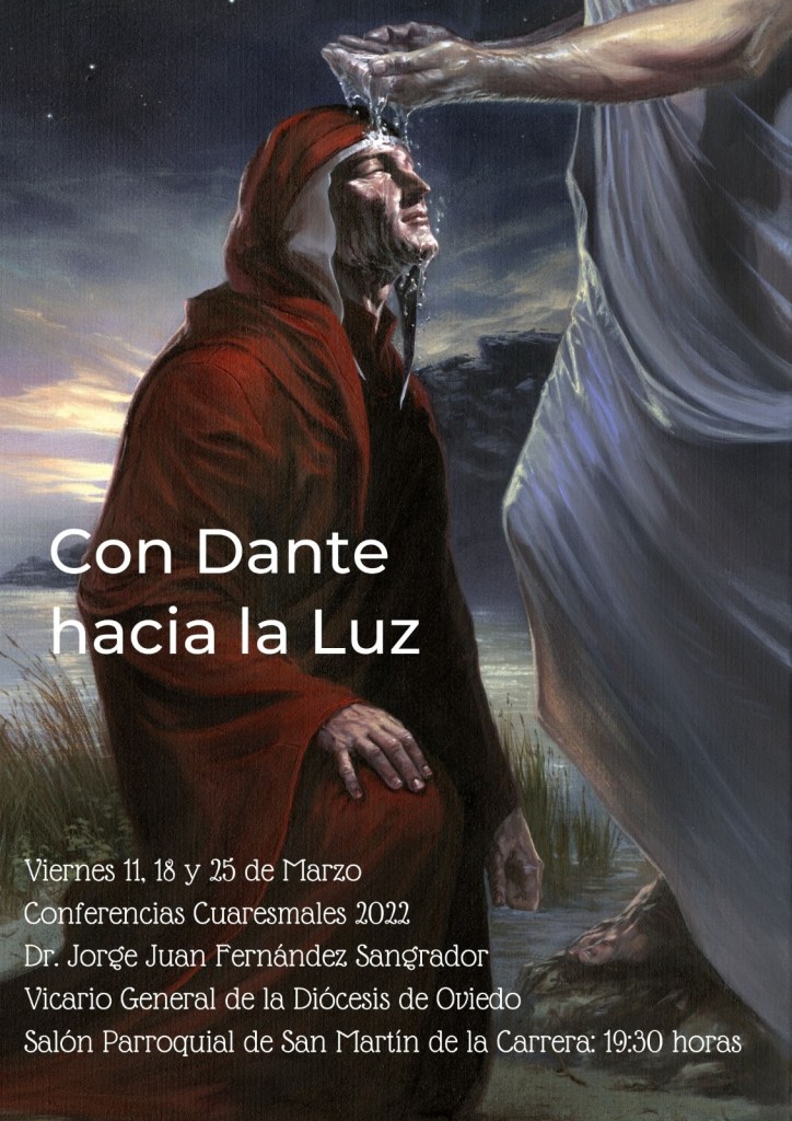 De ahí la oportunidad del ciclo de conferencias cuaresmales en el salón parroquial de La Carrera. En el cartel que se confeccionó para publicitarlas, sobre el motivo dibujado por Gabriele dell’Otto, aparece Dante en el momento en el que Virgilio le lava, como ablución purificatoria, el rostro: