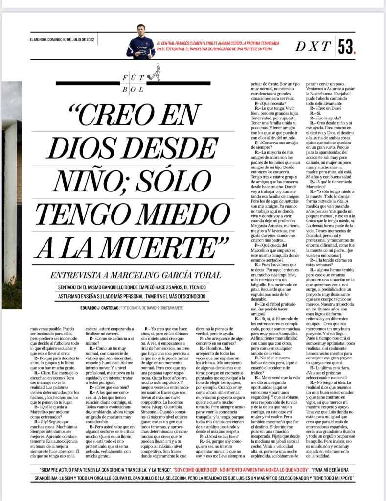 Marcelino García Toral confiesa abiertamente su fe en Dios en una entrevista que le ha hecho un periodista de «El Mundo» y que aparece publicada hoy 10 de julio de 2022.