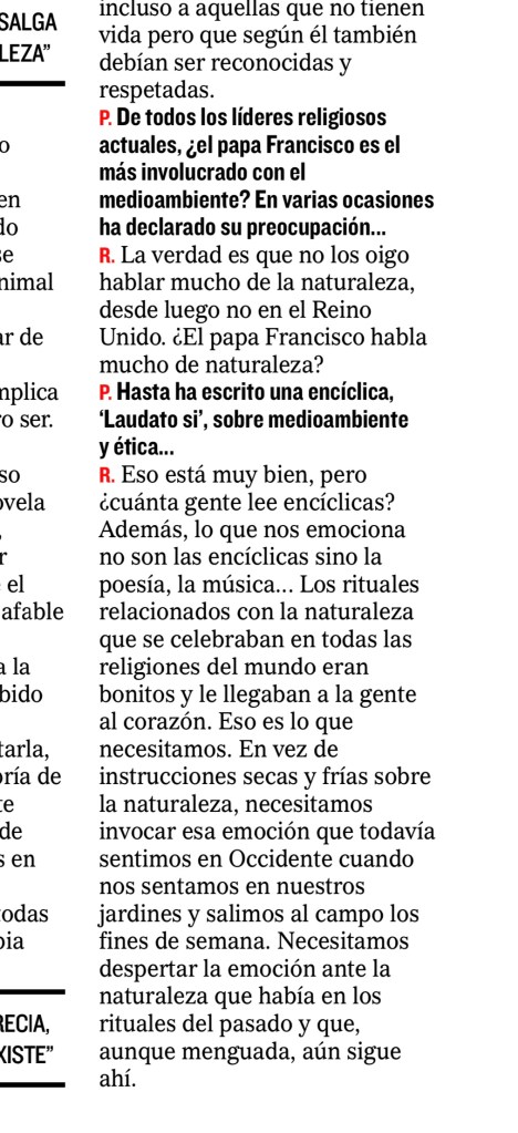 En el diario «El Mundo» de hoy (4 de septiembre de 2022), Karen Armstrong, experta en el entendimiento entre las tres grandes religiones monoteístas, asesora de la ONU, miembro del grupo de expertos de la Alianza de Civilizaciones, Premio Princesa de Asturias de Ciencias Sociales 2017 y ex monja de clausura, confiesa que no sabe que el Papa Francisco haya hablado sobre ecología y medio ambiente. Extraño, ¿no?