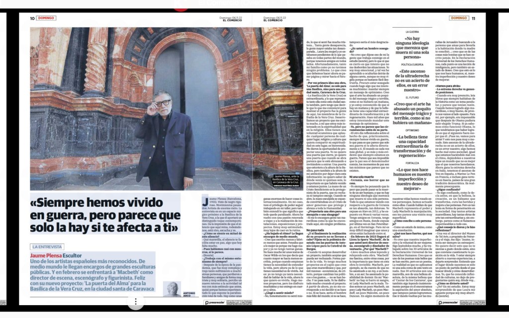 En el suplemento dominical para Oviedo del diario El Comercio (6 de noviembre de 2022, p. 10) viene una entrevista al escultor Jaume Plensa (Barcelona, 1955):