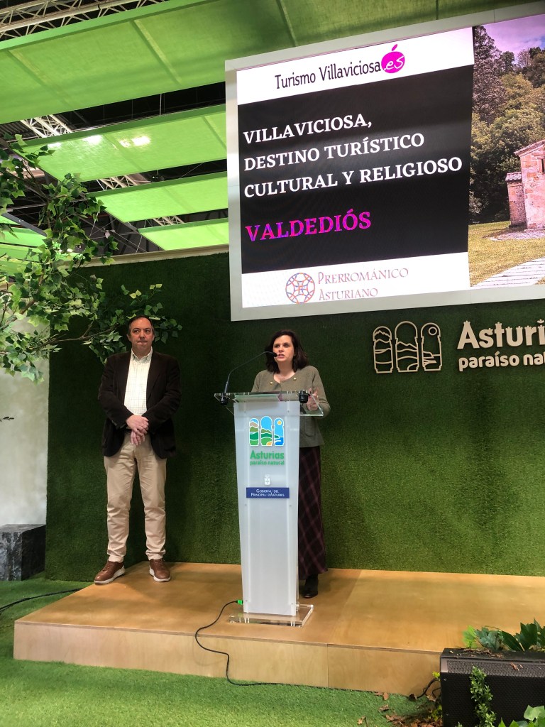 Alejandro Vega Riego, alcalde de Villaviciosa, y Loreto Pérez de la Fuente, coordinadora de la gestión turística de Valdediós, durante el acto de presentación de Valdediós en Fitur (Madrid, 18 de enero de 2023)
