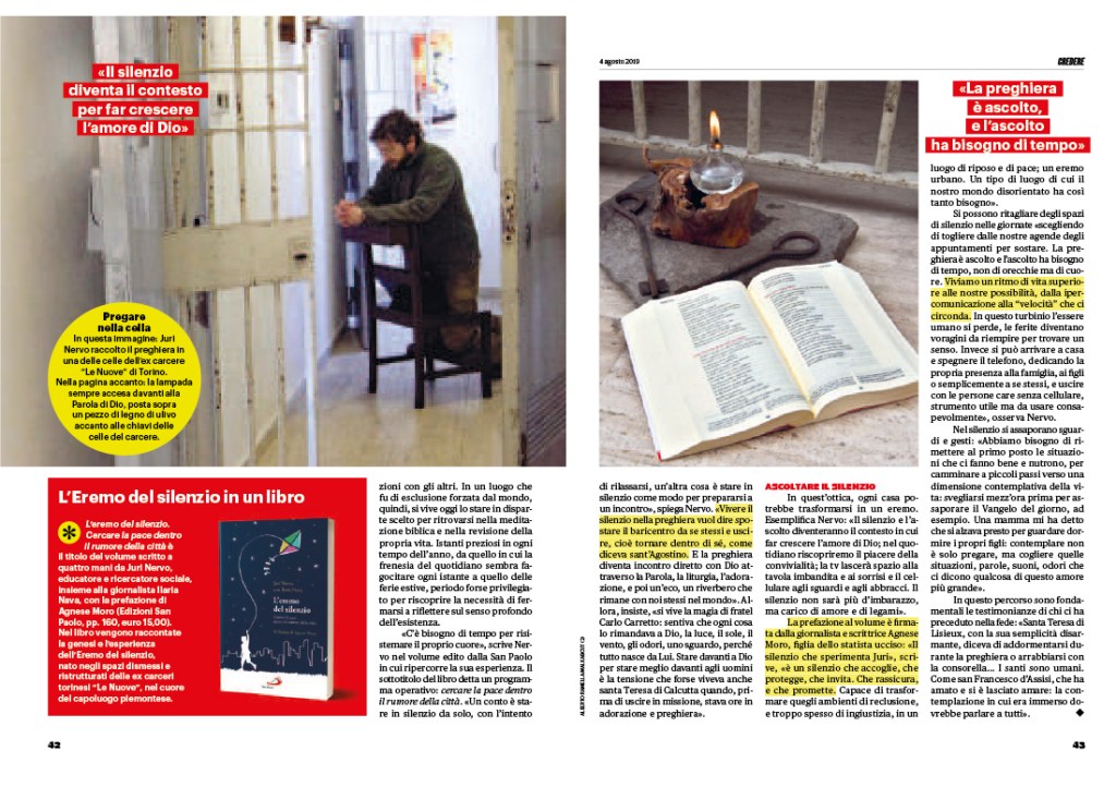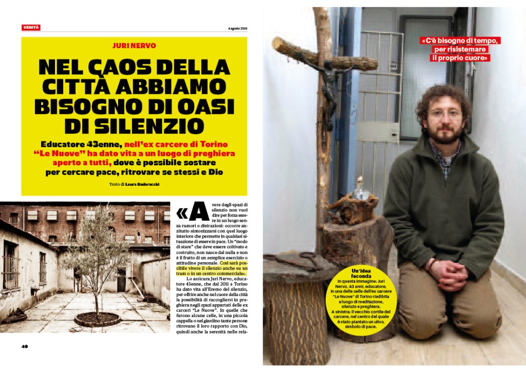 De aquí el que Juri Nervo, un seglar, casado con Luciana, dedicado a ayudar a quienes necesitan ser escuchados, a ser ungidos con el bálsamo del perdón y a encontrarse a sí mismos, haya habilitado, en uno de los brazos del antiguo complejo carcelario “Le Nuove” de Turín, un espacio al que ha denominado “Eremo del Silenzio”.