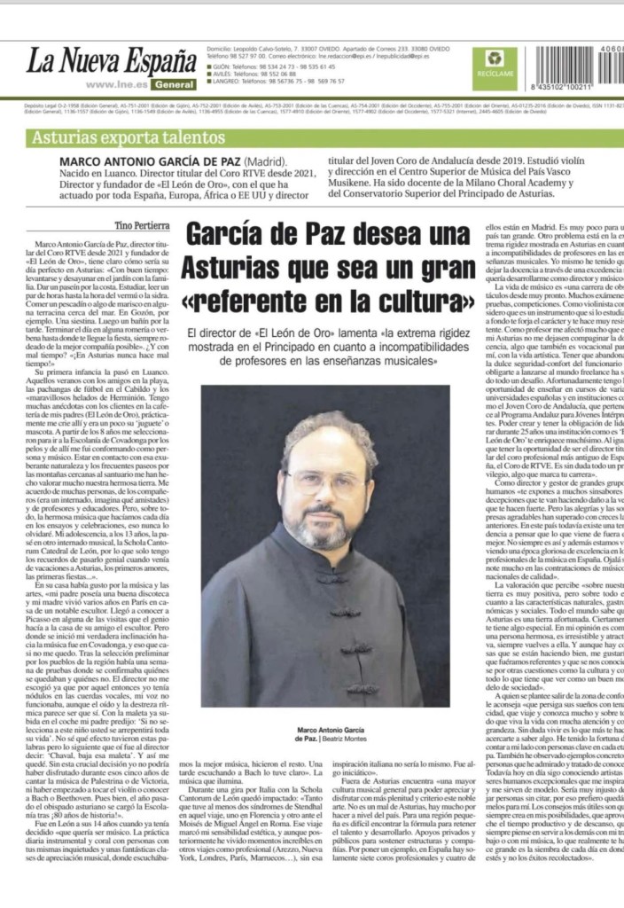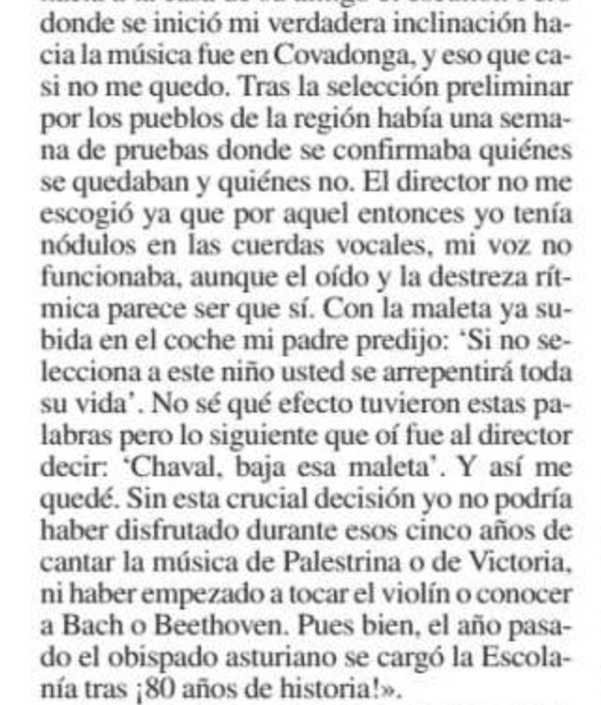 «Pero donde se inició mi verdadera inclinación hacia la música fue en Covadonga, y eso que casi no me quedo. Tras la selección preliminar por los pueblos de la región había una semana de pruebas donde se confirmaba quiénes se quedaban y quiénes no. El director no me escogió ya que por aquel entonces yo tenía nódulos en las cuerdas vocales, mi voz no funcionaba, aunque el oído y la destreza rítmica parece ser que sí. Con la maleta ya subida en el coche mi padre predijo: ‘Si no selecciona a este niño usted se arrepentirá toda su vida’. No sé qué efecto tuvieron estas palabras pero lo siguiente que oí fue al director decir: ‘Chaval, baja esa maleta’. Y así me quedé. Sin esta crucial decisión yo no podría haber disfrutado durante esos cinco años de cantar la música de Palestrina o de Victoria, ni haber empezado a tocar el violín o conocer a Bach o Beethoven. Pues bien, el año pasado el obispado asturiano se cargó la Escolanía tras ¡80 años de historia!».» (La Nueva España, 8 de junio de 2024).