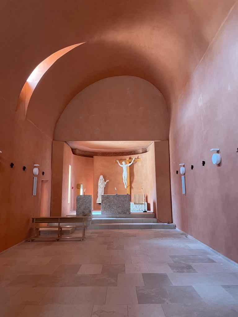 Una brevísima vía sacra, de madera, nos introduce en el santuario, revestido del rojo de los amaneceres, de los atardeceres y de la luna pascual que asistió silenciosa a los acontecimientos más trascendentales de la historia de la humanidad: la muerte y la resurrección de Cristo. Tres ventanales en lo alto, en forma de triángulo isósceles, hacen presente a la Santísima Trinidad. Y, si el triángulo es la figura geométrica de la perfección trinitaria, el efecto isósceles muestra que el Padre es la fuente primordial de la luz que ilumina la andadura humana, siendo luz también el Hijo y el Espíritu Santo.