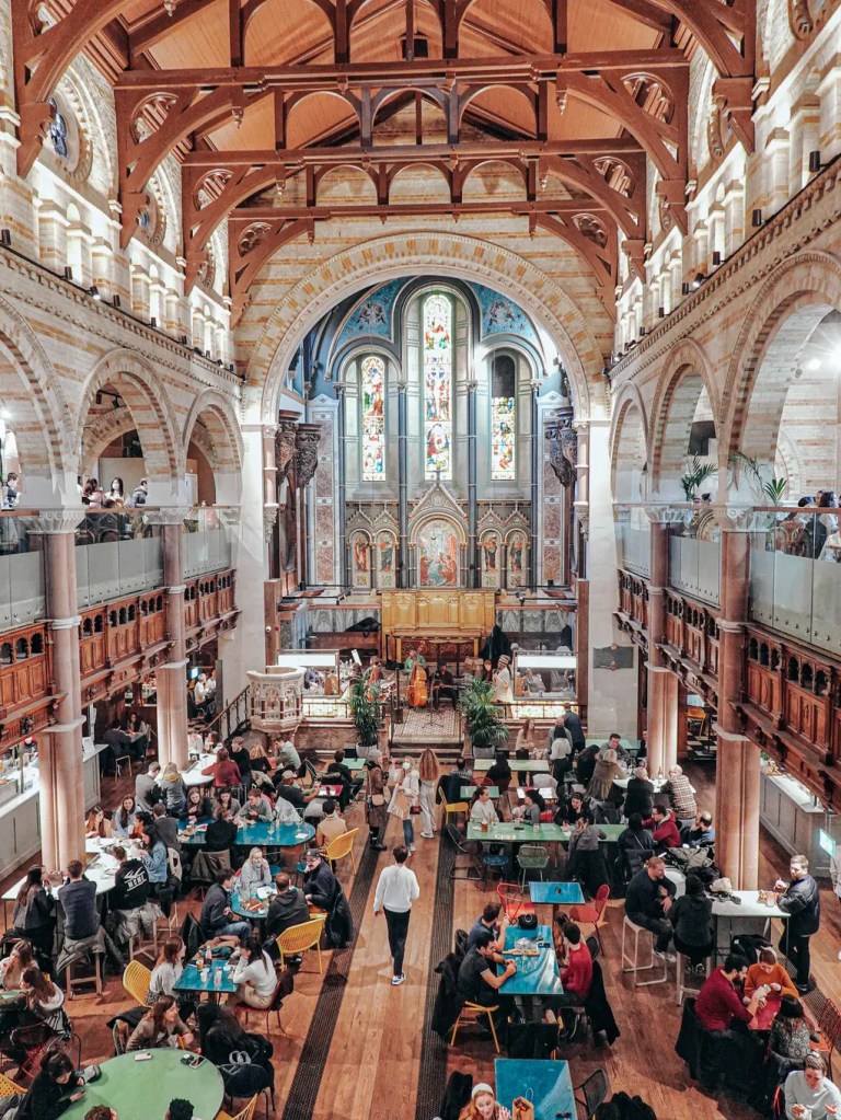 De un asturiano y para promoción de la gastronomía española en Londres, es decir, para regoldar fabada, cachopo y paella dentro de una iglesia. Y esa es toda la originalidad. Si fuese un local normal y corriente ¿iría la clientela que sale en la foto? No. Así que no van ni por la fabada, ni por el cachopo, ni por la paella. Que lo sepa el dueño. Ni tampoco por ese tipo de mesas ni de sillas, que se ven malas.