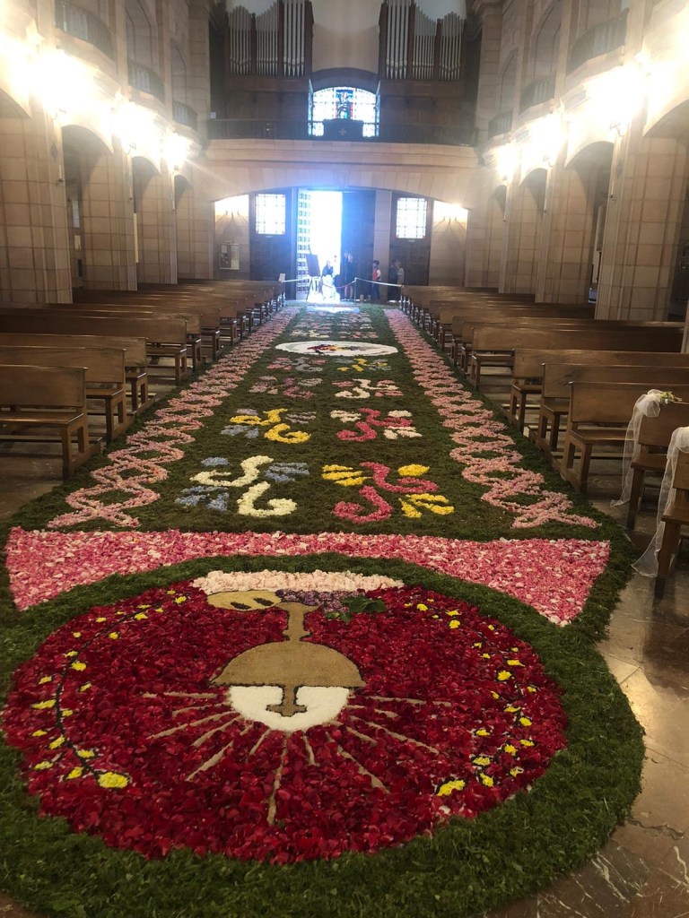Es una obra de encajes, filigranas y paciencia, en la que curas y feligresía participan con admirable dedicación, llevando las flores, distribuyendo tareas, organizando el plan general, marcando tiempos, haciendo los arreglos, individuando miles y miles de pétalos, colocando uno a uno… Un maravilla.