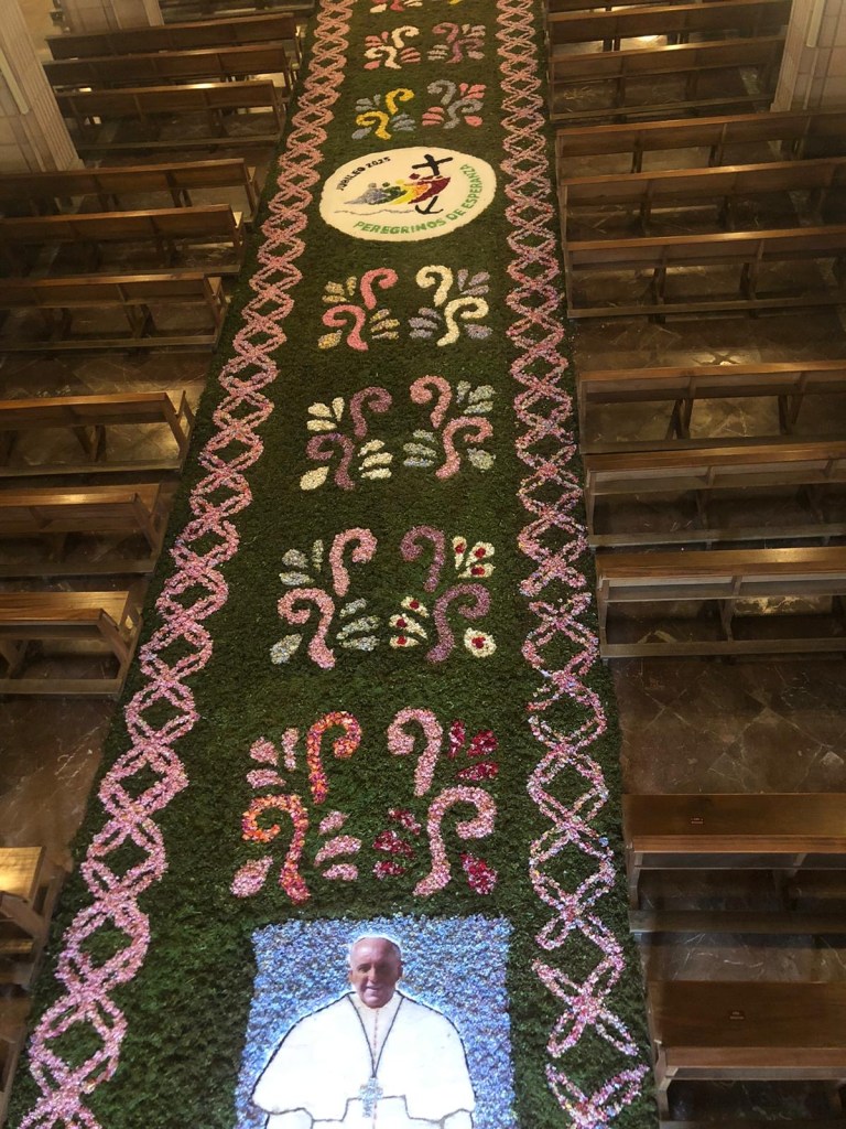Preciosas alfombras son las que cada año, para la fiesta del Corpus, se extienden sobre el suelo de la Iglesia parroquial de Santa Maria de Cangas de Onís, localidad asturiana en la que el amor a las flores y a la jardinería de algunos cangüeses está a la altura del de los británicos a sus extraordinarios jardines.