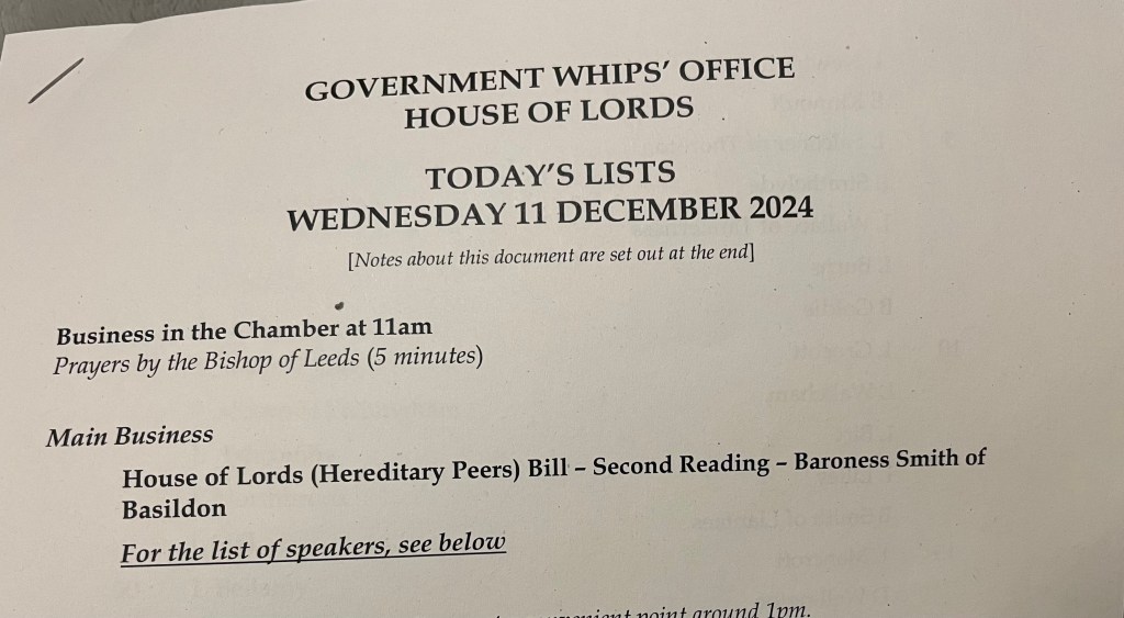 Esta tarde, 11 de diciembre de 2024, tuve el honor de asistir a una sesión de los Lores en el Parlamento británico, en el Palacio de Westminster. En ella se debatía una propuesta del actual gobierno: reducir el número de lores hereditarios que se sientan en la Cámara. Ha sido una tarde inolvidable.