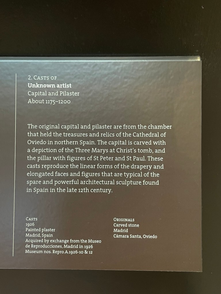 Están en una de las dos grandes salas (Cast Courts) en las que hay copias de algunas de las obras artísticas más importantes del mundo. Como, en el siglo XIX, no resultaba tan fácil emprender, como lo es hoy, un viaje largo fuera de las islas británicas, para que el público del Reino Unido pudiese ver, de alguna manera, las piezas más apreciadas por la crítica artística, se hicieron esas copias extraordinarias que merece la pena conocer cuando se está en Londres.